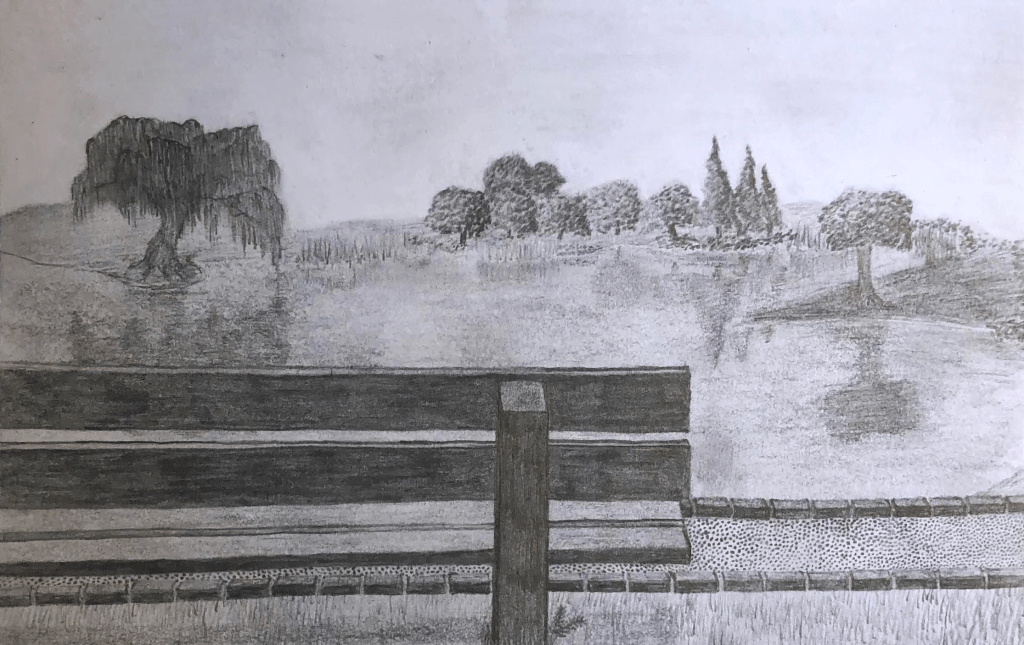 drawing of a bench and lake