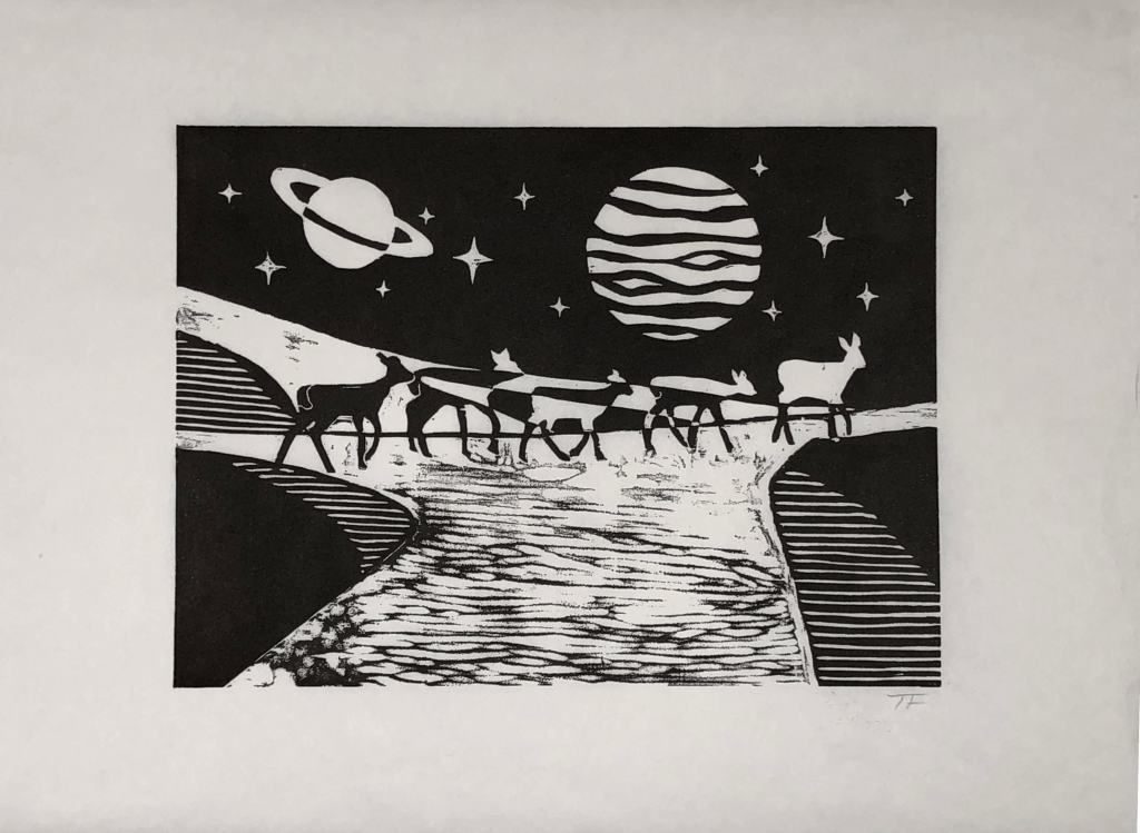 woodcut, deer on path in Binghamton